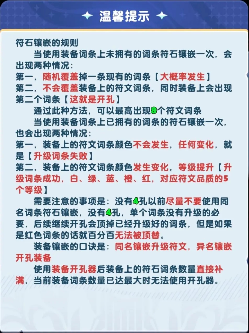 3、装备洗练:尽量装备8孔之后使用,主要洗练红色词条,很看脸,一般洗练2条可用红色词条后打自选符石凑成2套符文,或者洗练強散红符文进行散搭过渡使用