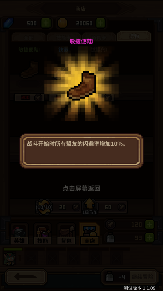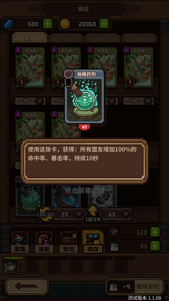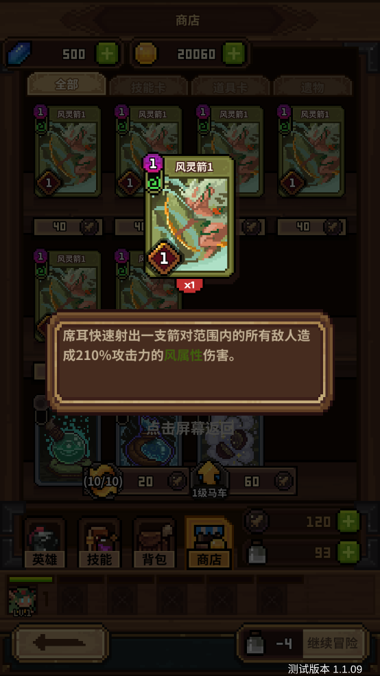 游戏中还有各种技能卡和道具卡,比如风灵箭能对范围敌人造成高额伤害,锐眼药剂能提升盟友的命中率和暴击率等等。遗物系统也增加了战斗的深度,敏捷便鞋可以提高闪避率,铁锹则能增强土属性攻击。