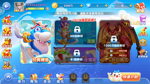 - 趣味社交功能,支持与好友组队共同捕鱼。