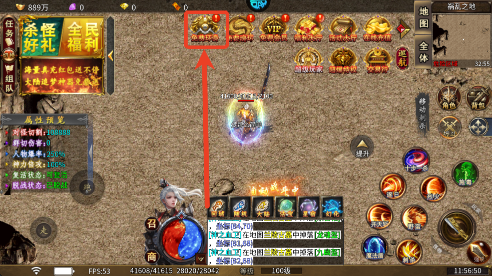 5、击败一些怪物之后记得点击上方的免费环身激活环身,可以提升属性。