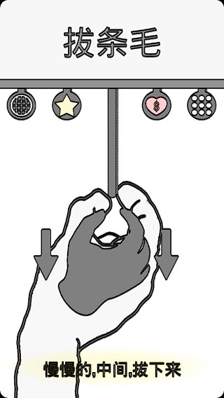 拔条毛官方版是一款恶搞主题的休闲娱乐类手游,虽然游戏画面采用简约的风格设计,但有着特别内涵的阐述,通过趣味而奇葩的玩法告诫我们要时刻了解自己的情感。在拔条毛里面用户会体验各种带有不同情感的毛:愤怒的毛,拖延的毛,悲伤的毛等等。它也是通过耐心、欢乐、积极、成就感等多种方式让你去体验,在繁忙的都市生活之中,各种不同的东西和事情都想尽办法去吸引我们的注意,有些时候我们会忽略了去了解自己的情感和心灵上的健康。拔条毛希望用轻松搞笑的方法把这个话题带到用户眼前,可以让你在你忙碌的生活中留意一下你的情绪意识的心理健康。另外,游戏的拔毛操作是非常简单的,就是用物理的方法跟在现实生活中一样用两根手指扯住屏幕中间的毛,然后往下拔就可以了。但由于拔条毛游戏采用的是关卡制,所以后期的拔毛也并不简单,每个关卡都有不一样的拔毛方式。整体来说游戏的玩法非常的新颖,有着很强的清新治愈力量,喜欢的朋友可以试试哦!