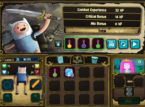 阿宝勇闯骷髅营是一款休闲放置类游戏,玩家在游戏中将扮演老皮的好朋友阿宝,但是骷髅兵将老皮抓走了,于是玩家需要踏上解救老皮的路途,与骷髅军决一死战。游戏采用关卡制,玩家在战斗过程中可以将健康、防御、攻击的药水装备上,增强相关力量,在关键时候使用物品或许可以扭转败局。每关结束后将会随机刷出物品,玩家可以将两个物品混合,可能会制造出更强大的物品,例如把战斗的剑与攻击药水混合可以让剑的攻击值大大提升。快来阿宝勇闯骷髅营游戏中,为阿宝打造一身金装,与骷髅兵决一死战!