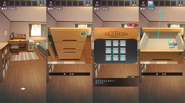 回到卧室,依照提示打开抽屉,取得里面的信纸与线轴,并使用信纸写好信(选中信纸点击桌面上的笔)。