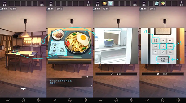 在冰箱里取得凉菜,桌面上取得纸条和炒面,将炒面放入微波炉里,功率切换为500W,加热3分30秒。