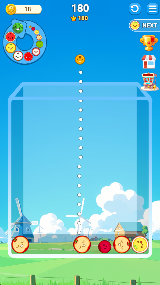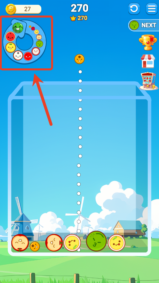 4、 对于合成的图鉴游戏直接性的表现出来,以及对于下一个出现的水果,游戏也有很好的表示,让我们玩家能有一个很好的参考。
