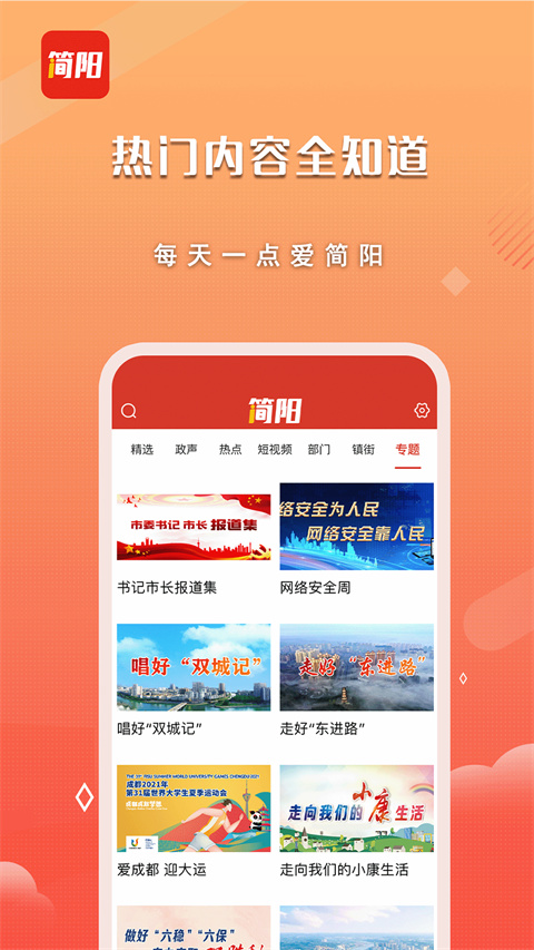 想了解到简阳最新最热门新闻资讯,那么不妨来试试i简阳app,这是一款专为简阳人民推出的一款生活服务软件,软件界面直观,功能丰富,拥有政声、热点、短视频、吃喝玩乐、政务服务、充值缴费、便民服务、直播、电视、广播等供用户们使用,旨在为用户带来便利。同时软件每天都会提供对应的新闻热点内容,让许多用户都能在上下班的时候浏览各种新闻,可以在平台轻松查询简阳市的各种政务、便民服务等,查询各种内容就会非常的快捷,可以获取对应的生活信息。除此之外,i简阳app定位为简阳人的温暖港湾,打造本地最大最活跃的朋友圈。不仅支持随时上线本地时政新闻、重大事件及社会民生热点,而且还支持24小时滚动更新国内最新最热资讯,及时发布政务便民信息。同时,链接市民所需的功能性板块,为用户提供一站式服务。有需要的用户不妨下载体验一下试试看吧!