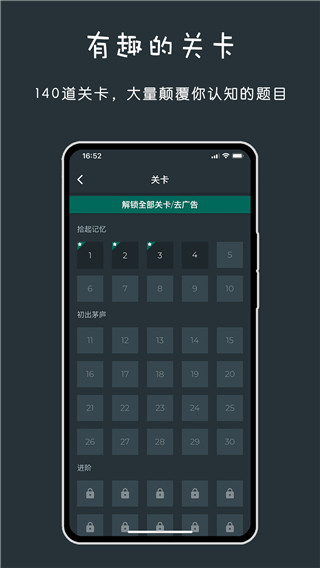 【关卡设置】 app将难度划分为多个阶段:拾起记忆、初出茅庐、进阶、崭露头角、百里挑一、数学家、大师、人类最高荣誉、外星人,循序渐进地提升学习挑战。