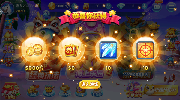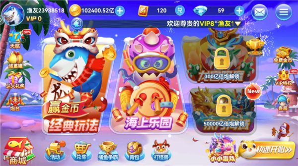 趣游捕鱼vivo版本中提供经典玩法、海上乐园、东方海域、打怪兽、小游戏等模式玩法,不同模式下需要达到相应的倍炮才能解锁,充满着非常大的挑战性,还有每日积分榜、每周积分榜、每月积分榜,根据玩家捕鱼积分统计,达到排行榜位置即可有奖励发发到你的邮件中。