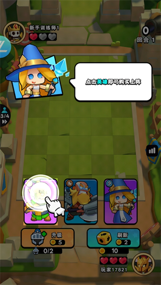 3、点击刷新刷连续刷到三个一样的英雄购买可以合成二星。