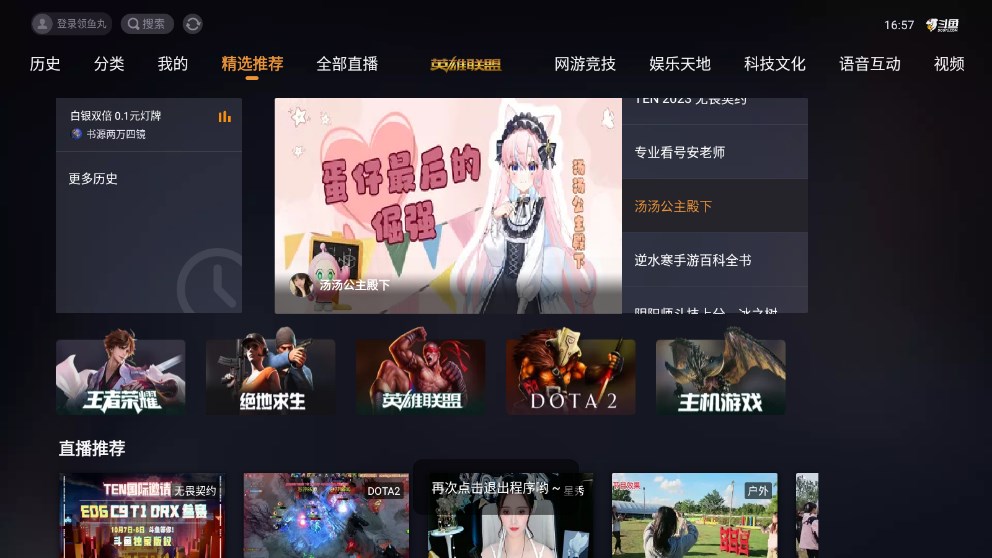 斗鱼TV版是国内知名的游戏实时直播平台,该版本支持在电视中使用,用户不再使用投屏进行观看,为大家提供一个更好的观看体验,工作一天后到家休息时候看,在周末休闲时候看!斗鱼TV里面入驻了大量游戏大佬,玩家可以在平台中观看直播,学习游戏技术,观看帅哥、美女,而现如今大多数用户不再使用app来观看,而是通过电视,但又不想通过投屏的方式来进行观看,非常麻烦,每一次都需要进行繁琐的投屏操作。
