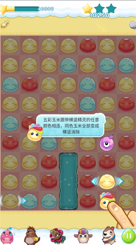 8、五彩玉米跟带横竖精灵的任意颜色相连,同色玉米全部变成横竖消除;