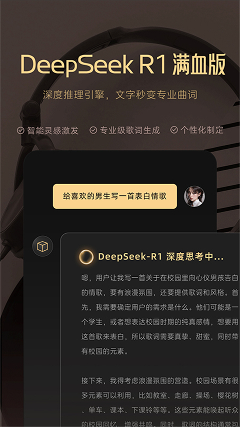 Muse AI现已接入DeepSeek R1满血版,用户进入应用只需要输入你需要创作歌曲的题材即可,例如给暗恋女生写一首歌,通过深度推理引擎,文字秒变专业曲词、选择风格即可一键生成不同风格的歌曲,生成好的歌曲还可发布在应用中供用户播放!此外,用户也不用担心创作的歌曲无版权保护,Muse AI App新增歌曲【数字存证】功能上线,为你的作品保驾护航!
