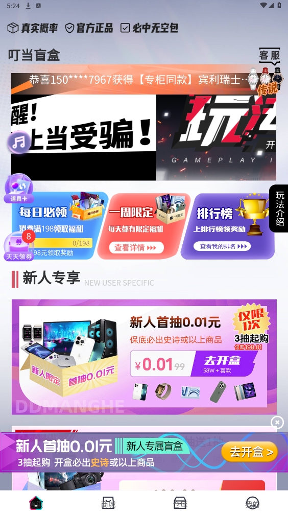 叮当盲盒App是一款盲盒购物应用。通过它用户进行抽奖有机会获得高端手机、笔记本电脑、无人机、电动车、化妆品、首饰项链等全新正品盲盒物件!并且,新人首抽只需0.01元即可有机会爆出大牌手机、电脑、潮玩手办!当然,为了保证商品售价高于盲盒价格,叮当盲盒App还具有保底机制,无空盒情况,只要不喜欢还可兑换其他商品。
