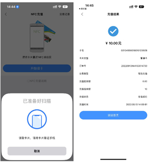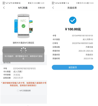 缴费成功后自动返回读卡页面自动充值,所以整个读卡、充值缴费、写卡充值过程中不要移动卡片,使卡片一直保持在手机NFC感应区域。写卡充值成功后将会看到充值结果,如钱包充值会看到充值前和充值后金额,月票充值可以看到充值月份,以及充值时间、圈存订单号等。