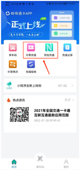 在应用首页选择"月票充值"或""钱包充值",进入相关NFC充值页面。如充值月票就选择月票充值,如果充值公交卡钱包余额就选择钱包充值。