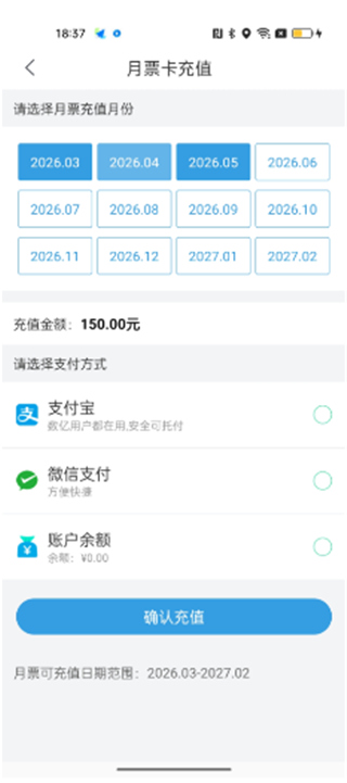 进入"月票充值"缴费页面,选择充值月份(月份选择时不能跨月充值,最多可充值12个月的月票)。可以选择支付宝、微信或者APP账户余额的支付方式进行缴费。扣费成功后将生成卡片待圈存订单,系统将会自动返回读卡页面进行写卡,所以整个读卡充值缴费过程中不要移动卡片。