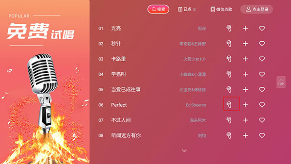 1、打开电视机,首先连接麦克风。根据您购买的麦克风产品选择连接,主要是有有线链接和无线蓝牙两种,前者将线材插入对应的数据口即可,后者需要打开电视的蓝牙列表,在麦克风打开蓝牙配对模式,配对成功之后即可。2、打开电视机的开唛K歌,在主界面可以看到点歌台、最近唱过、已点歌曲、经典金曲榜、酷我情歌榜、热门歌单、热门榜单等选项入口。
