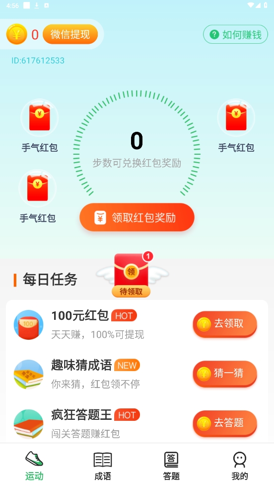 6、趣味赚钱模式:步数积攒能在应用内换取红包奖励,首次登录送新人红包,连续登录有惊喜礼包;运动首页的成语答题也能让用户利用闲散时间赚钱。