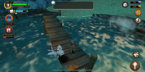 游戏中可以看到很多动画中出现的 NPC 哦,当然在这里他们会变成一个个教导你如何成为驯龙高手的导师。首先在系统指导下熟悉操作,左边的大虚拟摇杆控制行动方向,同时也是调整视角,不过游戏中视角和人物面向有时候不同步,所以想观察周围环境的时候就会觉得很不人性化。其他的操作则主要用点击触屏来实现,游戏总体很和谐,没有什么打打杀杀,基本上都是点击 NPC 对话和点击菜单完成相应的操作就 OK 了。主线任务还会出现大大的指引箭头,相当贴心。