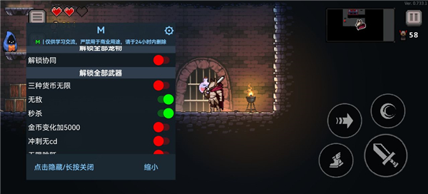 地牢杀手折相思最新版是一款Roguelike像素风类横向卷轴动作游戏,此版本为玩家提供26项MOD菜单功能,其中包含免广告获得奖励、免费内购、解锁全部皮肤、解锁全部宠物、解锁协同、三种货币无限、无敌、秒杀、金币变化加5000等等,可帮助玩家带来更好的游戏体验!