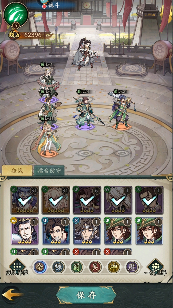 张飞主要堆防御属性:确保他能扛住敌方伤害,保护后排。