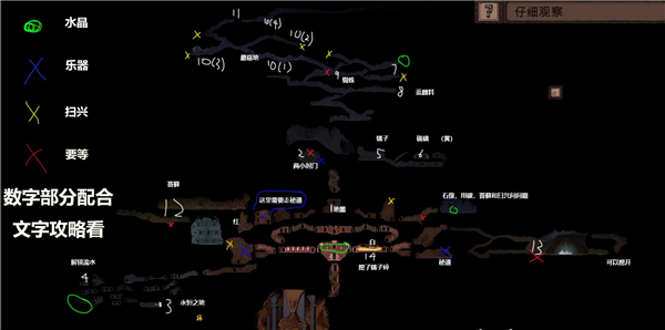开始游戏先去1地图然后去解锁2两小时门,然后可以去3永恒之间把东西捡了解锁床配方,然后把4水开了,回家把东西放一下,画几幅画,去探索一下别的地方,然后回家等门解锁,去5拿稿子,在歪歪的木头柱子顶上站久一点把6硫磺(黄颜料)挖了,然后木头捡了,去顶上挖7水晶拿8蓝色颜料把9蜘蛛赶到另一边织网,织完网你就可以上去10蘑菇地了,蘑菇地有两种,紫蘑菇10(1)和绿蘑菇10(2),一起种10(3)可以变大,种在10(4)位置,蘑菇地顶上11有一段可以挖开的。然后等到12苔藓长出来采集苔藓,13右下角有1个木板,其他8个都在顶上稿子拿到了之后别去敲14宝藏,会碎,要2把镐子才能挖开,最好有了3把之后再去挖,虽然没啥用4结局有3个都要到蘑菇地顶上才能触发然后顶上差不多就是井和塔楼了