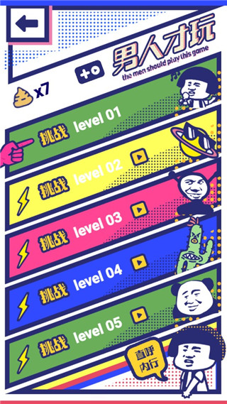 男人才玩官方版是一款充满着趣味性的休闲类游戏,游戏画面搞笑诙谐,人物角色也都是我们常用的熊猫表情包,非常有趣。同时游戏玩法非常的简单,在游戏开始时,玩家需要操控角色闯关成功后便可开启下一关卡,随着游戏的进展,关卡的难度会逐步增加,玩家需要开动脑筋,而且每个关卡界面都会有相应的小提示,玩家可以仔细观察用心分析,争取一次过关哦,如何没有过关就会显示就这就这,激发你挑战的欲望,要是很难的话,还可以看提示哦,可以帮助玩家快速通关,不过建议自己闯关,这样不仅有趣还很有成就感。男人才玩游戏内还会有很多意外的陷阱,需要小心应对哦。喜欢的玩家不妨下载男人才玩游戏体验一下试试看吧!