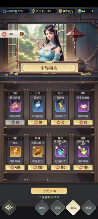 3、宇界商店秘药买满,但建议斗者后期甚至斗师在买,因为前面境界停留时间太短,而且大境界突破不刷新。