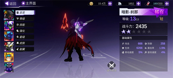 擅长潜行暗杀,是暗杀型近战角色。能够利用暗影之力瞬间出现在敌人身边发动致命一击,技能带有隐身和高爆发伤害的特点。普攻悄无声息地近身攻击;一技能进入隐身状态,接近敌人后瞬间现身造成额外伤害;二技能快速斩击,附带破甲效果;大招则是在暗影中爆发强大力量,对敌人造成巨额伤害并短暂控制,适合喜欢出其不意攻击的玩家。