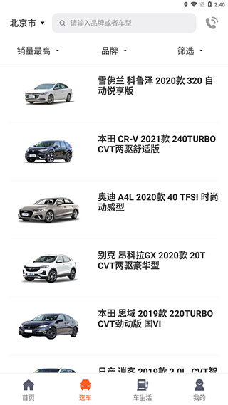 2、切换到【选车】界面,可以针对销量、品牌等条件进行筛选,以便快速找到您心仪的爱车。