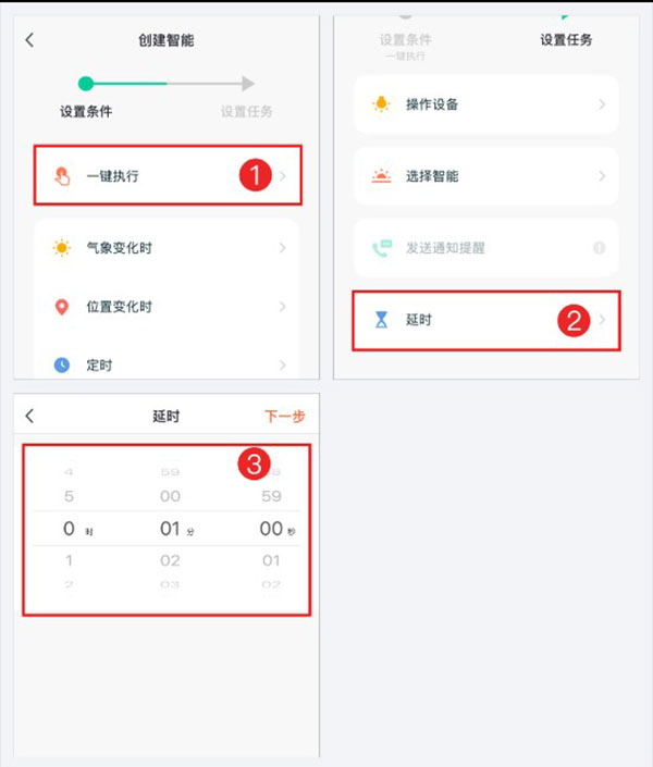 3、延时:添加一个延时的任务,例如:您可以通过在一键执行中添加延时,来让两个设备之间的联动有一个您希望的延时。
