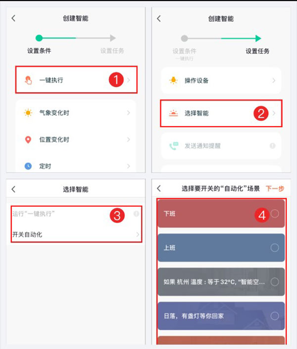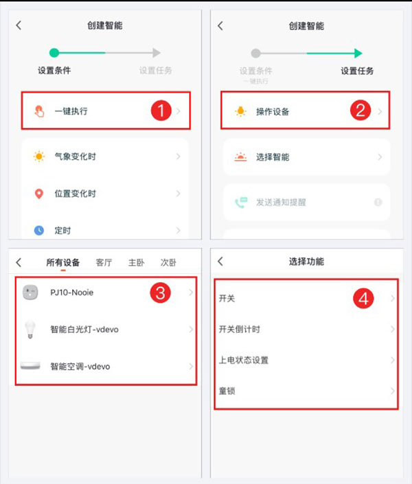 1、操作设备:添加您想要一键执行的智能设备,例如:您可以通过一键执行同时打开您家中所有需要打开的设备,而无需去挨个打开。