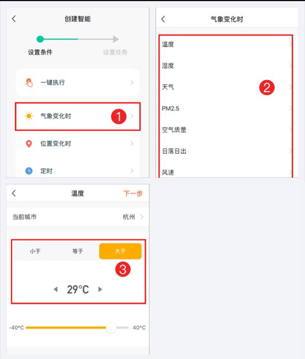4、气象变化时:通过外界环境与设备的联动,例如:您可以设置当温度高于29℃时,自动开启空调;或者PM2.5高于一个数值时,自动打开空气净化器。