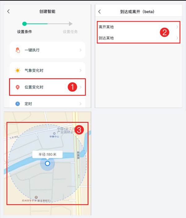 5、位置变化时:通过地理位置与设备之间的联动,您可以选择到达或者离开某地时,再执行具体的动作,例如:您可以设置当您到家附近时,自动打开家中空调和热水器;或者离开家时关掉家中的所有电器,并打开摄像头的移动侦测功能。
