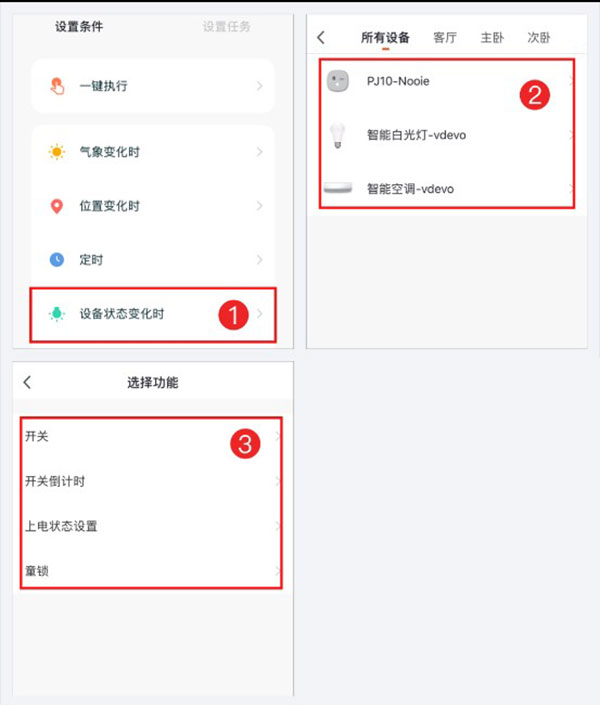 7、设备状态变化时:通过设备状态变化与设备之间的联动,例如:您可以设置当空调开启后,家中的香熏机和空气净化器也会自动开启;或者门磁设备开启时,触发家中的警报器。