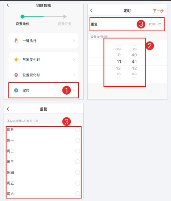 4、请确认您定时任务的生效时段是否有正确设置。点击“定时”任务,查看“重复”是否覆盖任务应该生效的时段(周一到周日可选)。