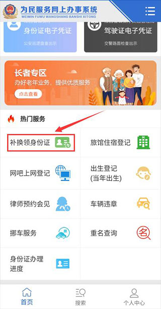 2、这时候我们在热门服务中就可以看到补换领身份证的选项了,点击后即可进入此功能。
