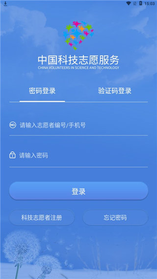 科技志愿者可先通过验证码完成登录,通过志愿者个人中心进行密码重置。