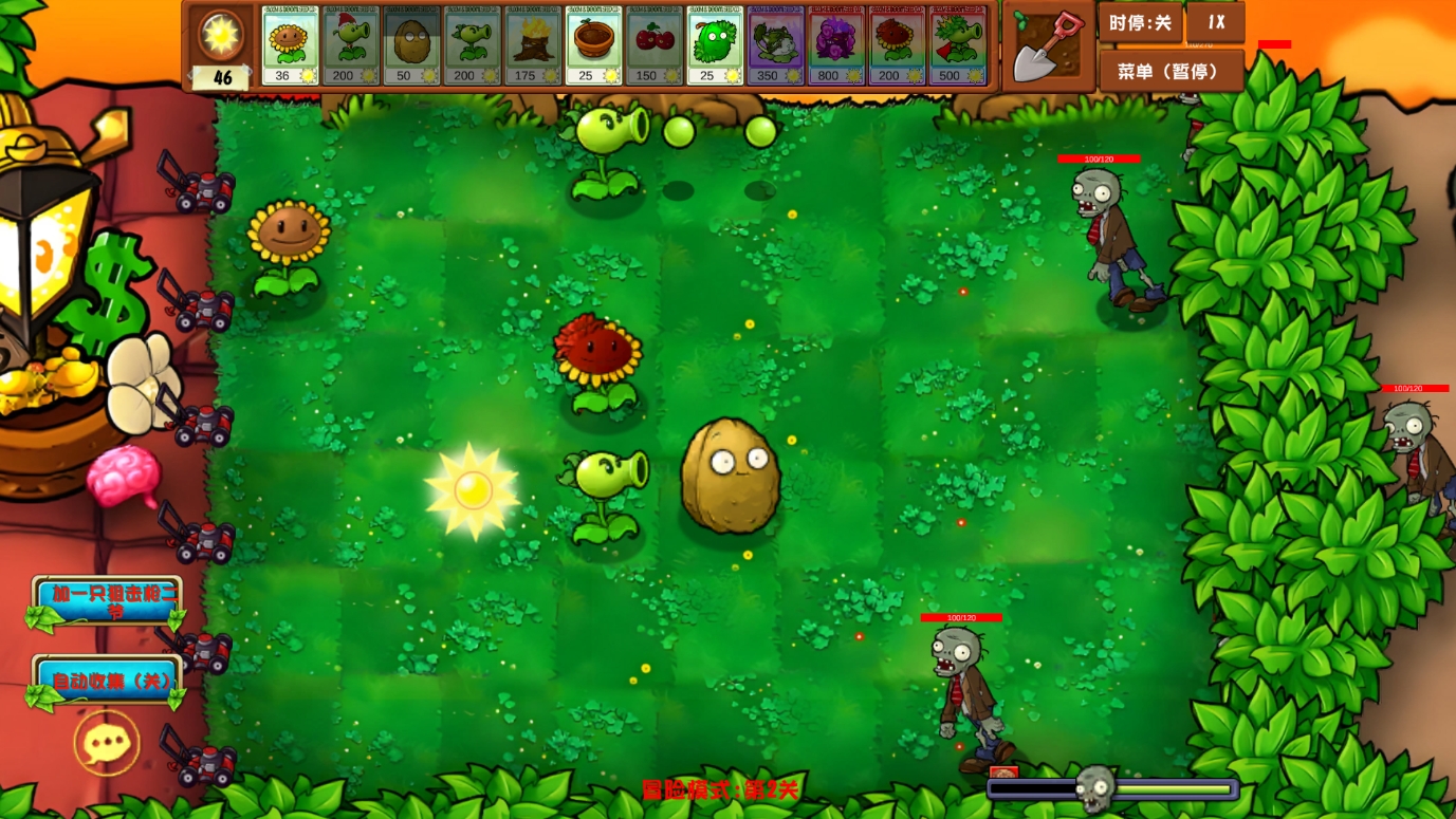 2、随后点击开始游戏正式开始关卡战斗,通过消耗阳光资源可以种植植物。