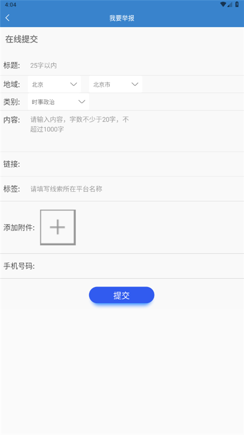 3、填写需要举报的标题、地点、类别、内容、联机、线索所在平台名称、手机号,并进行提交即可