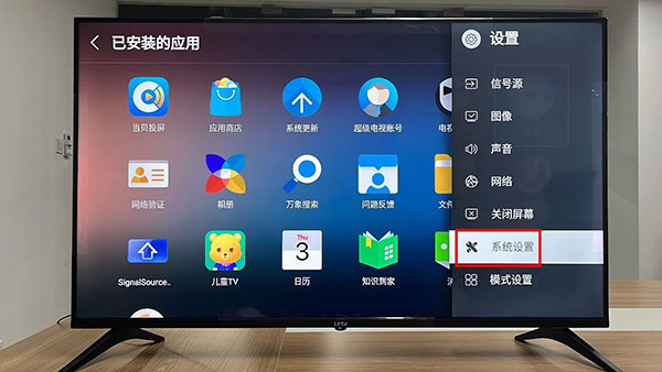 1、先下载【当贝市场乐视版】的安装包,并复制到U盘。然后按遥控器上的设置键或在【应用】已安装的应用里打开设置-【系统设置】。
