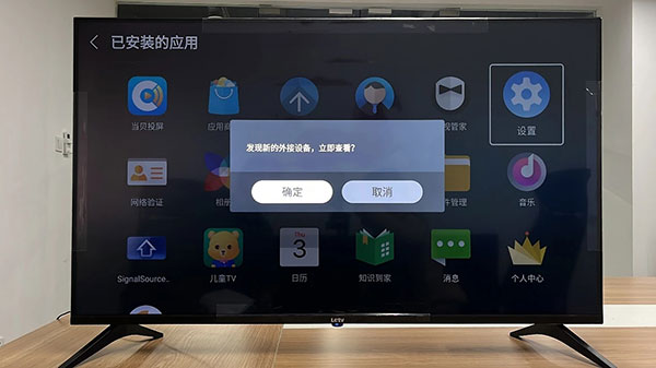 3、成功开启后,将U盘插到电视上,会弹窗提示发现外接设备,选择【确定】进入查看。