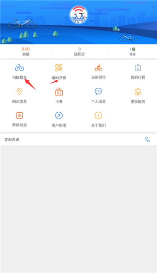 3、充值成功后就可以进行租自行车了,我们可以选择扫描租车、编码开锁;