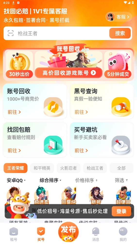螃蟹租号App是一款专业的游戏租号平台,它为玩家提供端游、手游等高级账号的租号、买号、卖号服务!螃蟹租号平台App涵盖《王者荣耀》、《和平精英》等主流热门游戏,有海量带绝版皮肤、满级载具、V10等高端大神账号供你体验。并且,软件支持自动上号,无需手动输入账号密码,极大程度保护大家的账号安全!