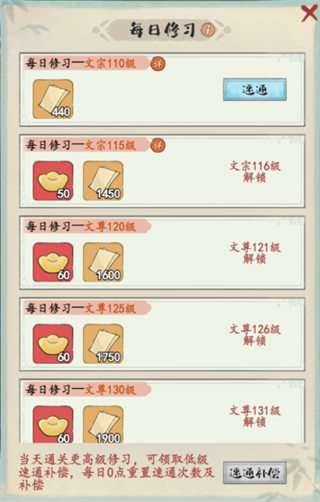 1、每日修习是获取宣纸的重要途径,修习奖励分为首通与速通奖励,首通奖励仅第一次通关后获取,通关后关卡变为速通关卡,每日可免费速通一次,消耗元宝获取5次,元宝消耗量随着速通次数的增加而递增,最终可获取到【速通收益】*【速通次数】的等量宣纸