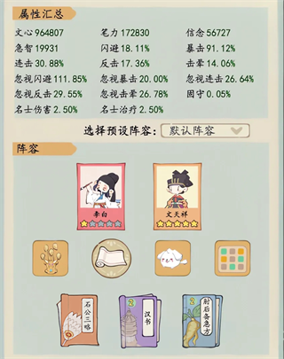 若''暴击流''进行挑战时可预设以下阵容进行挑战,名士推荐携带李白和文天祥,然后主要携带传家宝盒[高级·九天匣]、宠物小狗来提高忽视闪避属性,其次可携带万卷书-兵法[石公三略],从而提高暴击属性