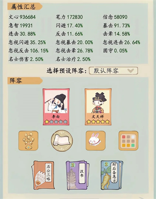 若''暴击流''进行挑战时可预设以下阵容进行挑战,名士推荐携带李白和文天祥,然后主要携带传家宝盒[高级·玉清匣]、宠物小兔子来提高忽视反击属性,其次可携带万卷书-兵法[石公三略],从而提高暴击属性;