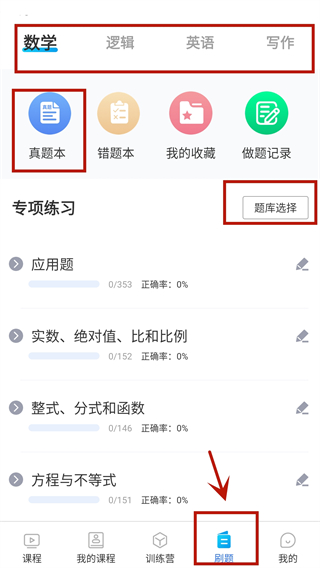 “数学、逻辑、英语、写作”四大科目、“历年真题题库、押题预测,专项训练系统”三大刷题模块。