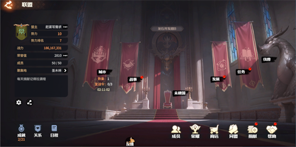 3、加入联盟:联盟作为游戏中唯一的领主组织,需要在联盟功能开启后,尽快加入或创建联盟,无需等待联盟中心开放。加入联盟后,观察盟友的活跃程度,决定自己的去留;建议优先选择人多的联盟加入,在盟友的互相帮助下可以实现快速发育,解锁更多玩法。