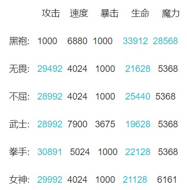 对比上面武士和拳手,可知:拳手比武士多了1.3个60攻击刻印,而少了近3个60速度刻印和3.1个60级暴击刻印。属性数据上武士略优于拳手,但拳手技能好,而武士有辅助技能,所以,爱用啥用啥。